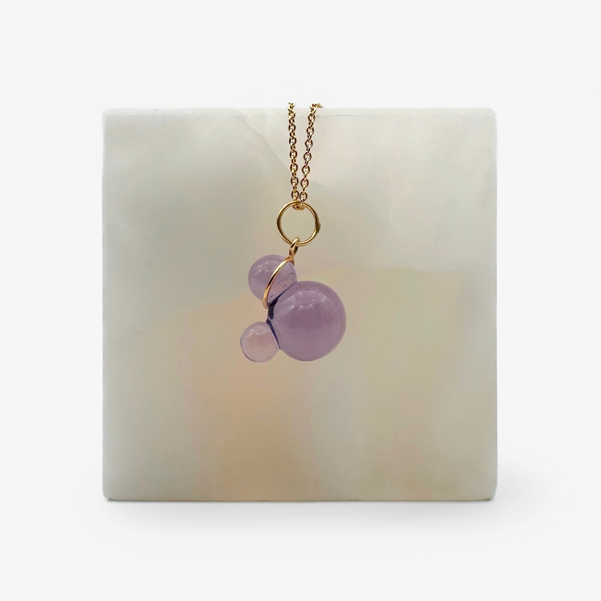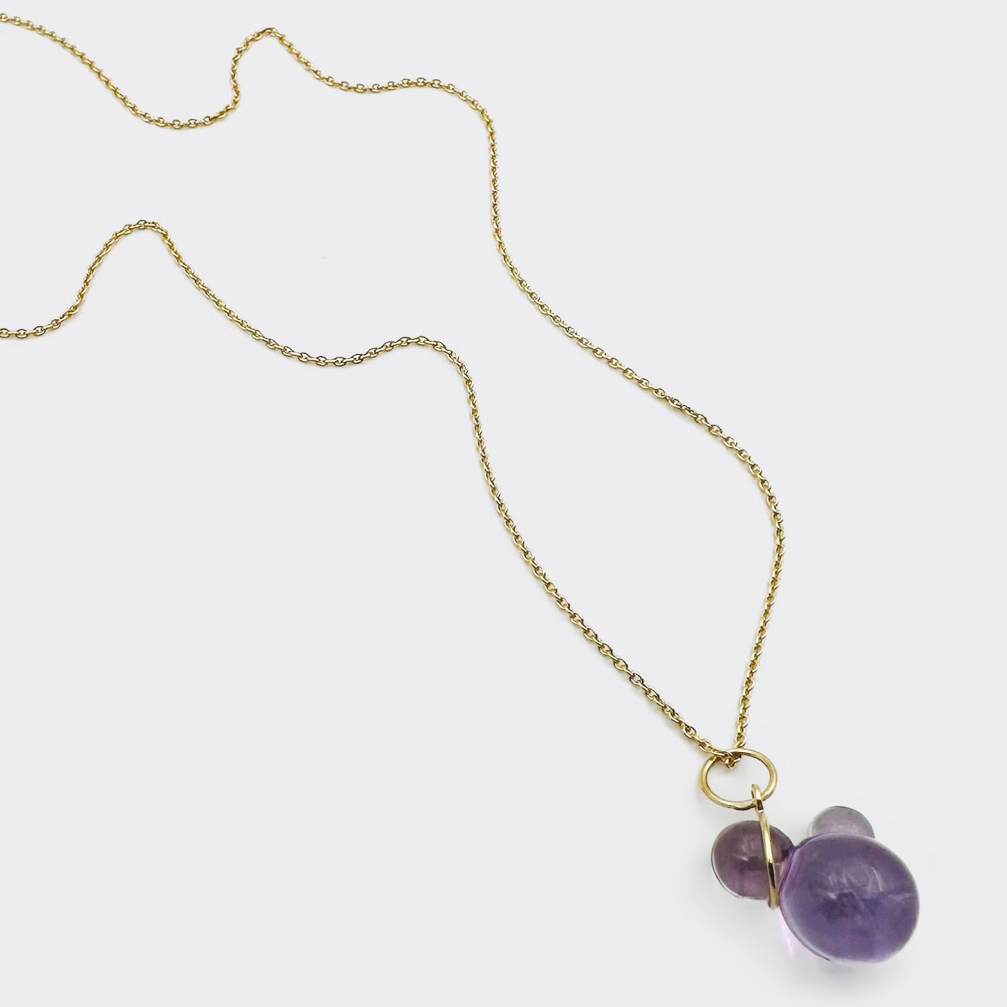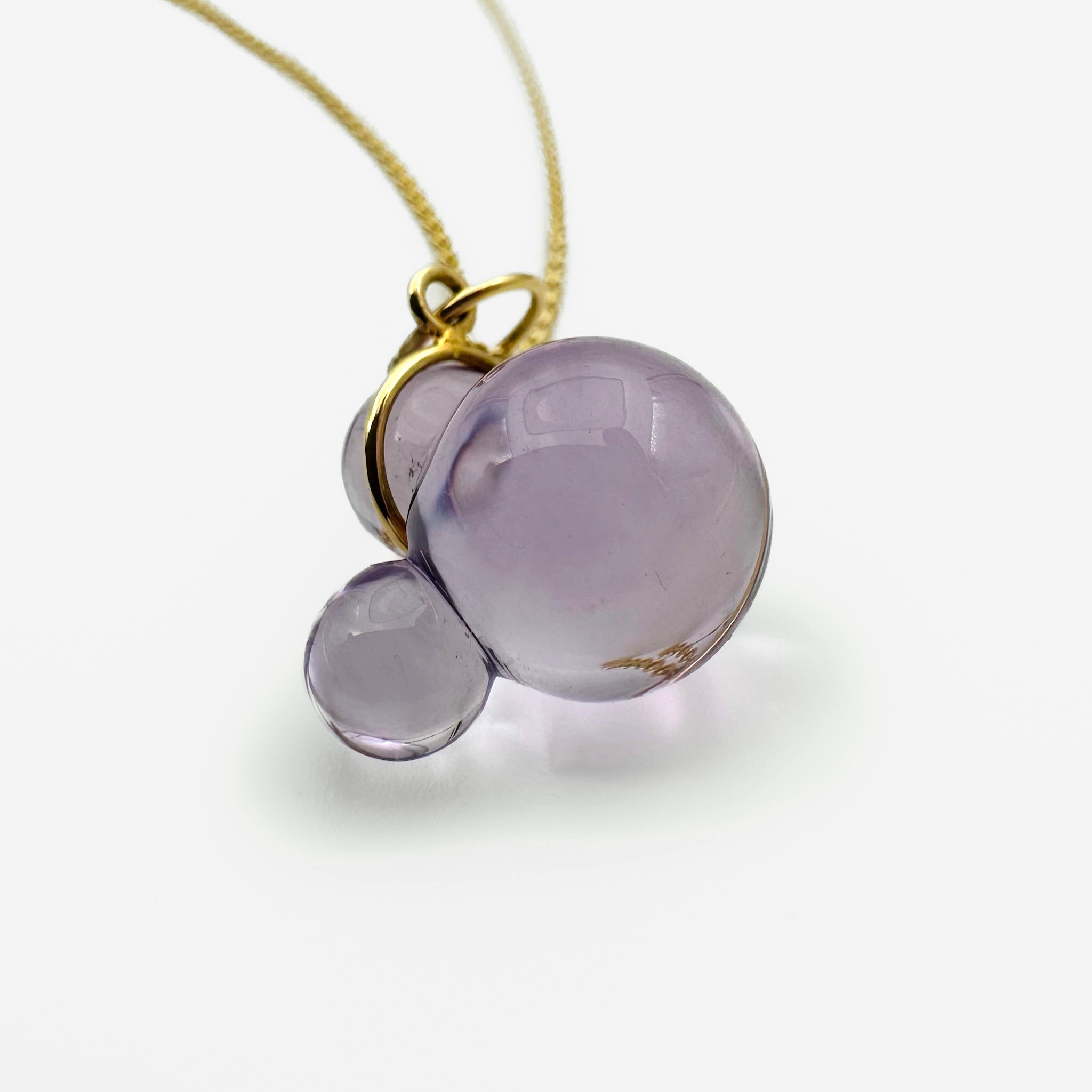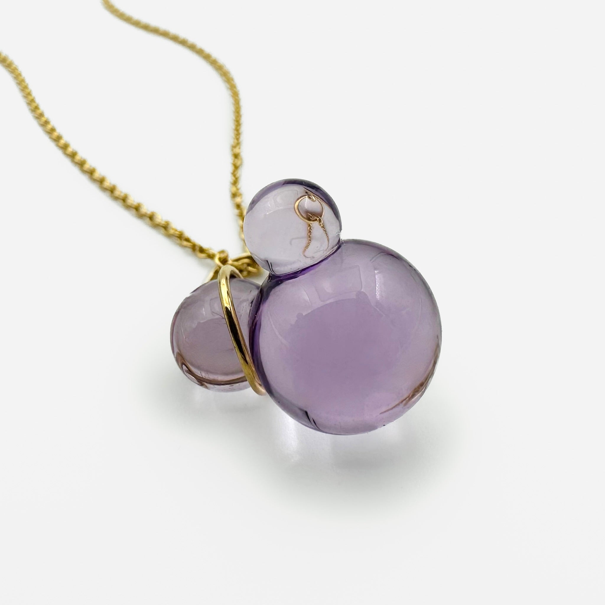 This striking pendant showcases a hand-carved Amethyst stone featuring a distinctive bubble design, meticulously sculpted from a single piece — no glue, just masterful craftsmanship. The pendant is set in 18K gold and paired with a complementary 14K yellow gold chain for a refined, radiant finish.
